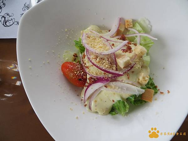 上面滿滿的料,紫洋蔥絲、小番茄、麵包塊、新鮮生菜,還有撒上增添香氣的起司粉